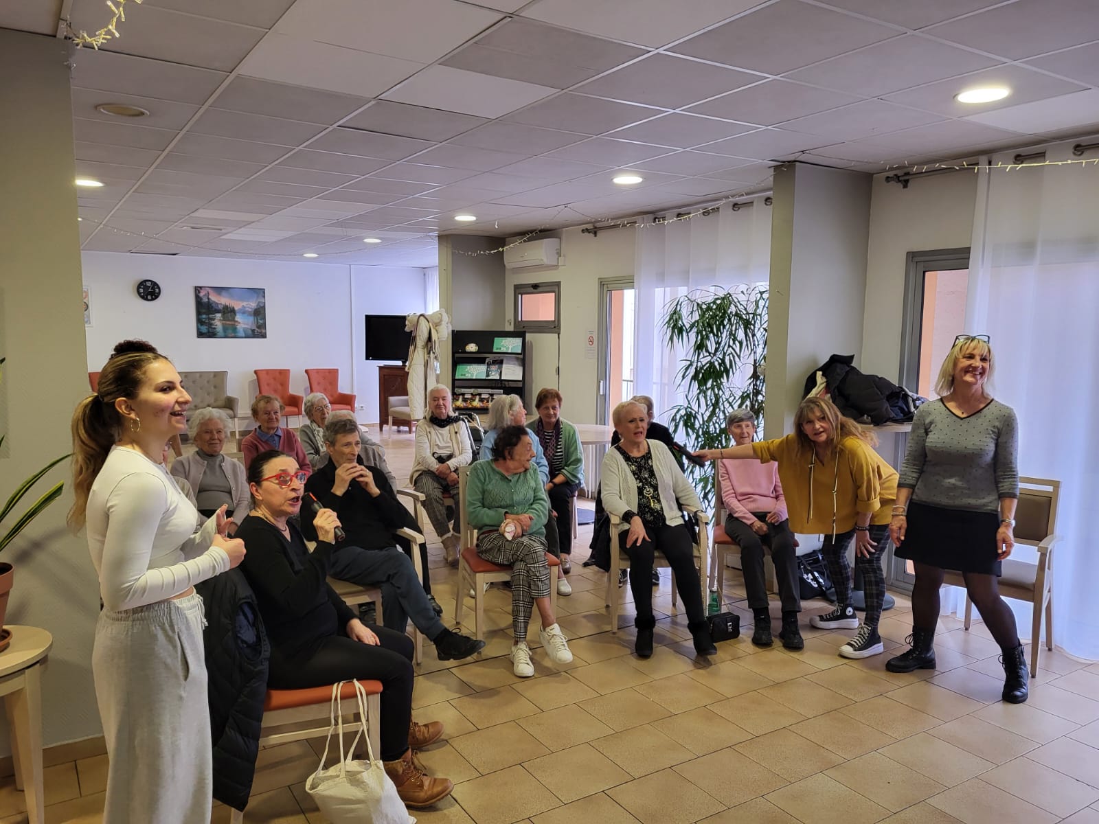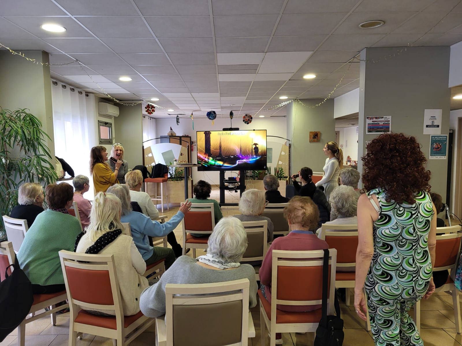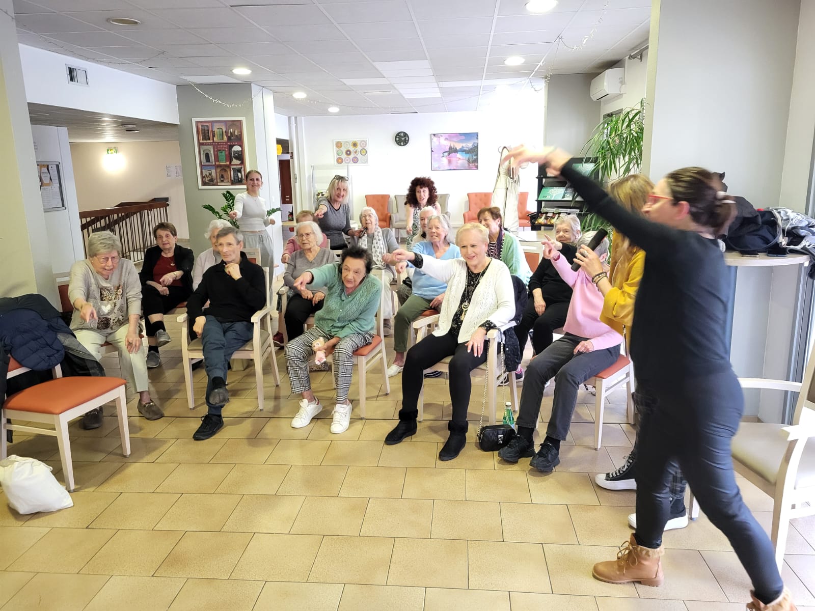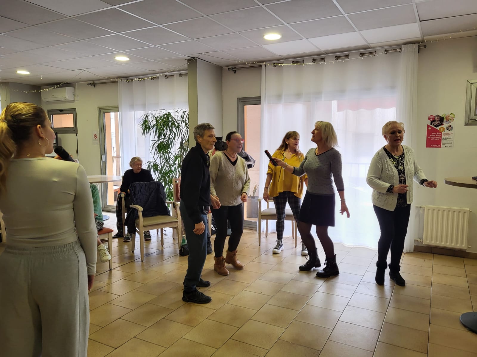 Véronique, Martine, Chantallou, Marie Thérèse, Victoria et Orlando (à la technique) ont animé ce moment avec enthousiasme, offrant aux résidentes un véritable temps d’évasion, ponctué de rires, de chansons… et même de quelques pas de danse!