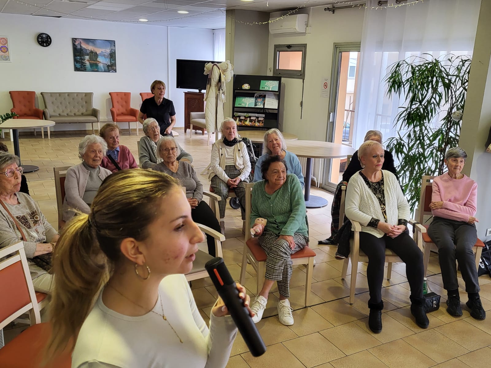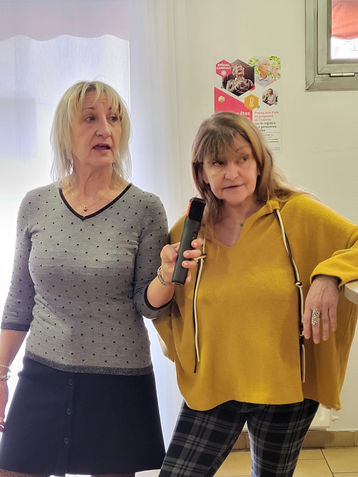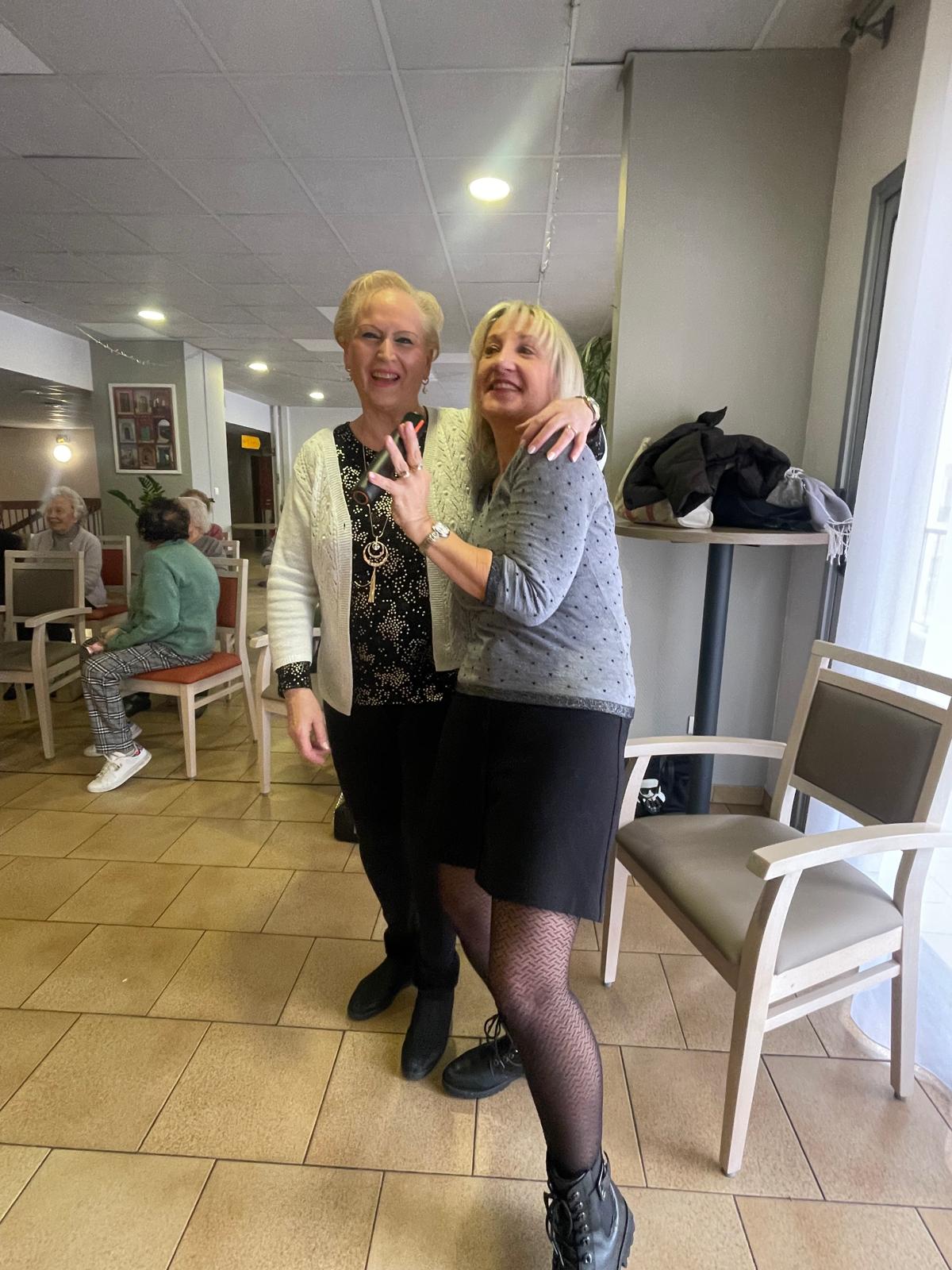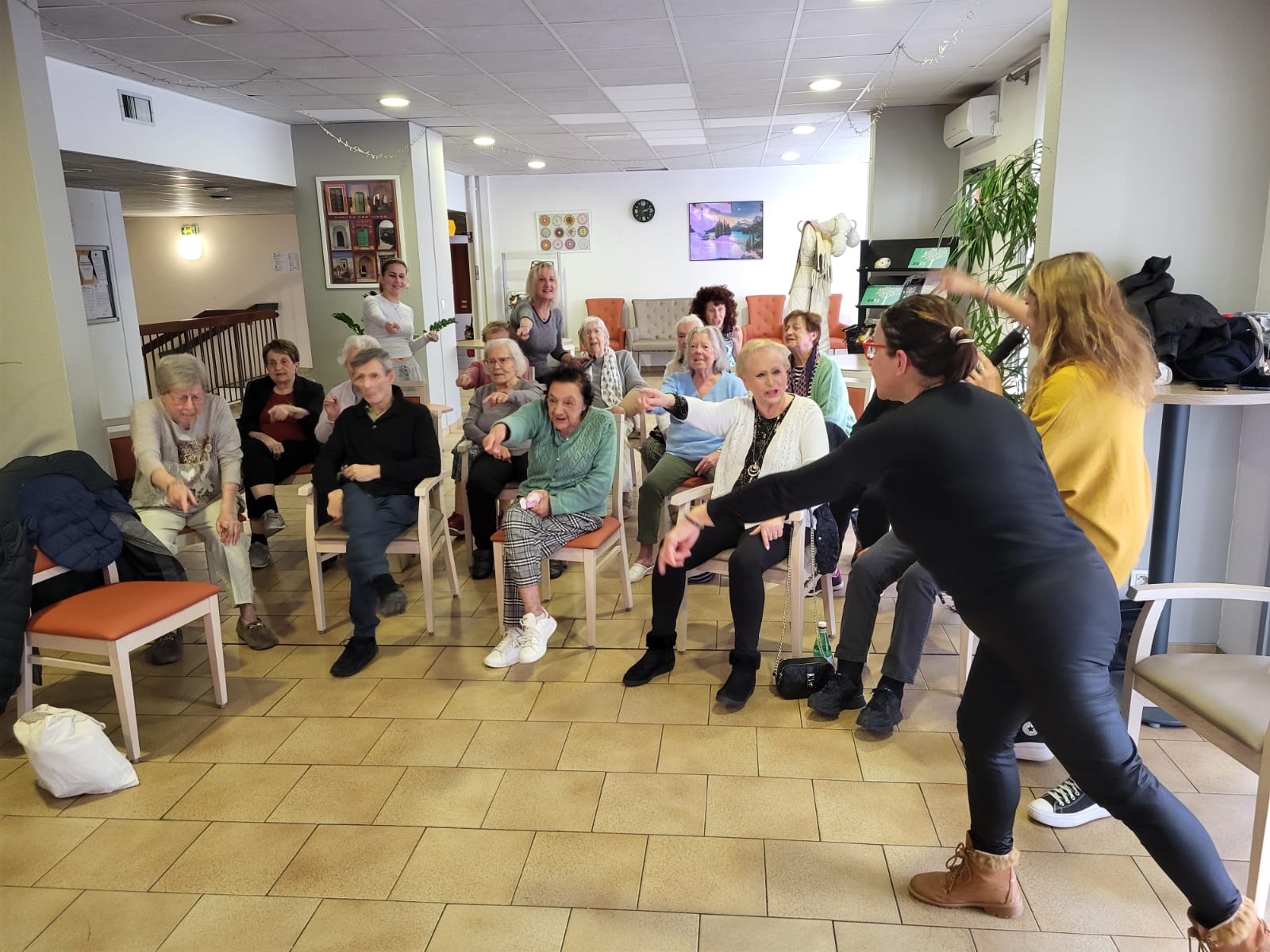 Véronique, Martine, Chantallou, Marie Thérèse, Victoria et Orlando (à la technique) ont animé ce moment avec enthousiasme, offrant aux résidentes un véritable temps d’évasion, ponctué de rires, de chansons… et même de quelques pas de danse!